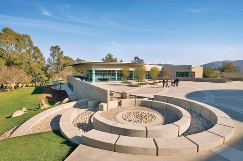 Cuyamaca College Business and Technology Building, El Cajon, Calif. The Business and Technology Building at the top of campus was previously a wooded lot. The landscape design saved the Torrey pines and incorporated them into a drought-tolerant landscape that embraces the site topography. The buildings are built into the sloping site. The landscape is a series of terraces and slopes with gardens, stairs and built-in ramps. A small plaza atop the entrance and at the lower elevation creates social spaces for business students to enjoy the views and connect to their campus.