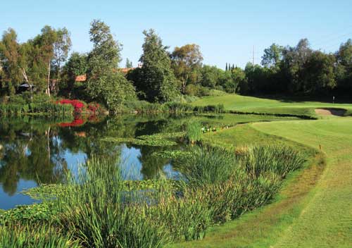 The Bridges at Rancho Santa-Fe Golf Course, San Diego, Calif. The golf course meanders through the 500-acre development. The site was a tomato farm prior to becoming a world class golf/residential community. Except for a few pristine canyons (protected in place) with dense coastal sage, the rest of the development was void of any living plants. The firm mixed a traditional Tuscan plant palette with native peppers, sycamores, oaks, coastal sage plants, and succulents to frame the fairways of the course.