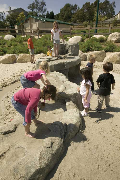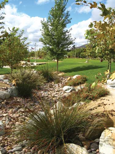 Cottonwood Creek Park, Encinitas, Calif. This award winning eight-acre park offers open turf areas, tennis courts, a group picnic gazebo, a veteran’s memorial, a number of low-impact development features and a children’s play area. The creek was revegetated with native plants and provides bioremediation and flood control for 2,100 acres of watershed that flows into the park. Interpretive panels and tiles along a perimeter pathway give interesting facts about the watershed. The large play area incorporates local animal paw prints and references to the creek. In addition to the traditional play equipment is a nine-foot climbing boulder and water play feature designed by the firm. The project was one of the 150 projects accepted into the Sustainable Sites Initiative pilot program. Photo: John Durant