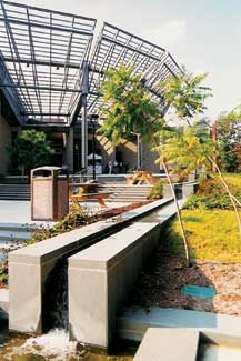 In the main entry court the visitor receives educational information and experiences the interweaving of cultures represented in the melding of water, curvilinear cobble and exposed aggregate patterns, which flow over and between the rigid and agricultural straight lines of the traditional welcome center entry walk.