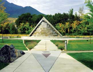 A sculpted sundial superimposed over a grand compass is the focal point of the campus. This water feature embodies Covey's teaching that people need a "personal center." It also reflects the unchanging nature of direction (?EUR??,,????'??compass?EUR??,,????'?? or effectiveness) and the fickle nature of time (?EUR??,,????'??clock?EUR??,,????'?? or efficiency).