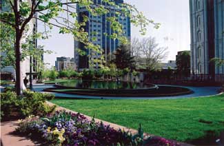 Site Amenities: Flanking lawn panels, sandstone walls and benches provide the millions of annual visitors to this campus a variety of opportunities to relax, contemplate and refresh themselves amidst the surrounding urban din.