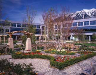 The site and landscape design for the corporate campus of Covey Leadership reflects the values of a firm that specializes in personal and corporate training to improve efficiency and effectiveness.