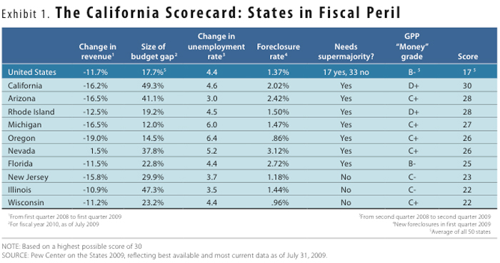 Pew scored all 50 states according to six factors that contributed substantially to California’s ongoing financial crisis: 1. high foreclosure rates 2. increasing joblessness 3. loss of state revenues 4. relative size of budget gaps 5. legal obstacles to balanced budgets—specifically, a supermajority requirement for some or all tax increases or budget bills 6. poor money-management practices.