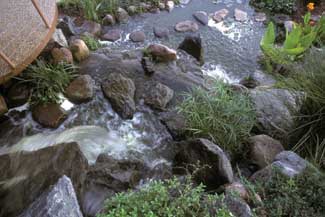 A garden path leads down to the next pool in the cascades, allowing access to the lowest deck using a similar arrangement of key boulders. Although this pathway through the water does not expose travelers so closely to the waterfall it does lead through a stunning water lily garden. Glass panels inserted in the floor of the deck level above allow light down to this deck level. Without them the variety and health of the plantings would be limited. This deck leads to a small beach area on the shore of the river.