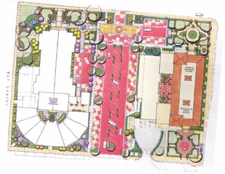 Design: Entrance monumentation helps to complement the historical buildings and the existing Cathedral church. The colorful site plan disguises the adaptive use between the Cathedral Church and the Diocese office. A rooftop garden provides an excluded respite to the Diocese offices.