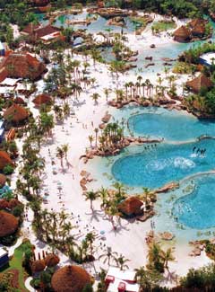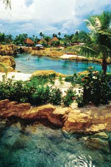 Design: Fresh water streams flow into a lazy river, which encircles saltwater lagoons. A theme bridge connects areas along the dense flora pathway and simulated vines encircle the bridge railings.