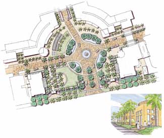 The central streetscape plaza for a mixed use complex linking the downtown district to the northern expansion corridor of the Naples downtown district, urban design. Aerial photos of a central mixed use destination center show a linear park along its frontage linking it to the downtown district in all directions. The major public green space, a village square concept covering two acres, providing for the dynamic interaction of urban activities. An overall plan view of the marina resort serves as an anchor destination at the eastern end of the downtown district. JRL is currently working on three major downtown developments that are positioned to change the Olde Naples Landscape by providing cohesive links, destination places and a pedestrian friendly downtown district. A public gathering place integrates the waterfront setting of Naples Bay and the Gordon River.