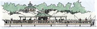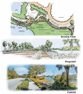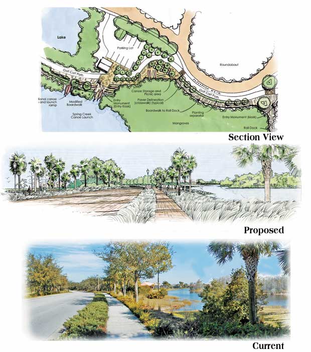 As shown in this diagram outlining the major components of the enhancement master plan, JRL, the landscape architect for the original planned community, is currently developing an enhancement master plan for the gated community to bring it to current standards. The concept emphasizes the Southwest Florida landscape. A collage of the arrival gateways and roadway preserve relationships. Major enhancement elements incorporate roadways, arrival entrances, pathways and trails, educational preserve sites and greenspace parks, while conveying the design for the selected parks and preserve overlook. The project won awards from the Florida Chapter of ASLA, American Association of Nurserymen, American Planners Association, Florida Nurserymen, Growers and Landscape Association and Native Plant Society. The canoe/kayak park and waterfront social center show the integration with the natural preserves.