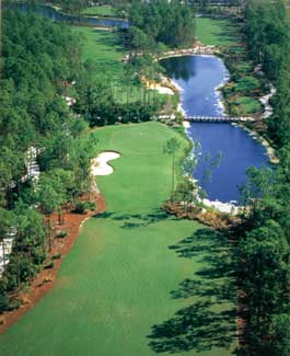 A birdseye view of the Tiburon Golf Course delicately carved through the site to conserve the existing pine uplands as the major landscape. The utilization of a mulch under-story is another technique of reducing water consumption, turf and maintenance. JRL, working in close coordination with the Developer (WCI) and the golf course architect (Greg Norman Design), created a beautiful golf landscape that respects all aspects of the traditions of golf design and the environmental demands of conservation and preservation. Aerial photographs depict Tiburon, a Florida native landscape golf course, in its early developmental stage, weaving through the preserves. Substantial use of coquina sand as a groundcover provides a unique golf landscape, conserves water and reduces turf and turf maintenance. It won awards from the Florida Chapter of ASLA and Native Plant Society. Lake banks and littoral shelves are planted with native grasses and groundcovers to prevent erosion, filter run off, define golf hazard lines, create a native landscape and produce a wildlife habitat. Exotics were removed from the native pine uplands to provide a translucent veil protecting the privacy of the golf sanctuary while allowing beautiful residential vistas. A 27-hole resort golf development is delicately woven through two major preserves.