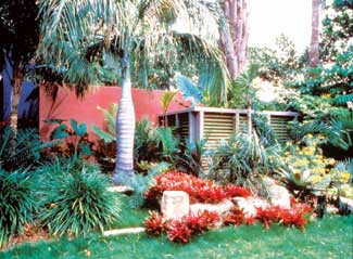 The residence has a spectacular view towards the private front garden from the adjacent roadway. The louvered wood fence meets code requirements and allows passage of cooling breezes. The fence and walls become the architecture. The non-descript building fades into the garden. Color animates and unifies all elements and spaces. Across the public front porch, you can see through the gate and into the inner sanctum of the front garden. The floating concrete panel steps and porch are textured with rock salt and given a mineral patina for color. The private exterior garden room and interior space are fused to create a sense of continuity; a design philosophy employed throughout the property. The longer more narrow lap pool replaced an existing pool which was elevated from the ground plane, and too wide for the garden?EUR??,,????'???s proportion. A fountain wall built specifically on which to hang a ceramic mural by Roberto Burle Marx and his protege Haruyoshi Ono, animates the space.