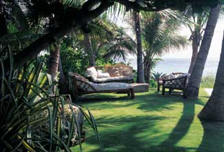 Dense naturalistic planting complements the boldness of the architecture at this Landes residence. The water garden invites one to the front door and was inspired by works of Roberto Burle Marx in Brazil. The sculptural space is defined at the property line with dense indigenous plantings at the front door. The illusion is produced that it is merely the edge of a clearing. What actually lies beyond is a major roadway with a colonial Williamsburg residence on the other side. Sculptural plant shapes complement the strong architecture. Coconut palms were massed to provide shade in this lawn lounging area. The owner designed the furniture and had it manufactured in her facility in Ecuador.
