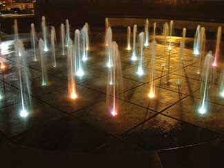 The outer nozzle/scupper fountain (above) uses a single display pump to bring water to the nozzles and weirs. A wind control prevents the nozzles from spraying the surrounding hardscape. Lighting is by submersible low-voltage fixtures each containing three MR-16 bulbs in primary red, blue, and green, which provides a generally white light with colored highlights.