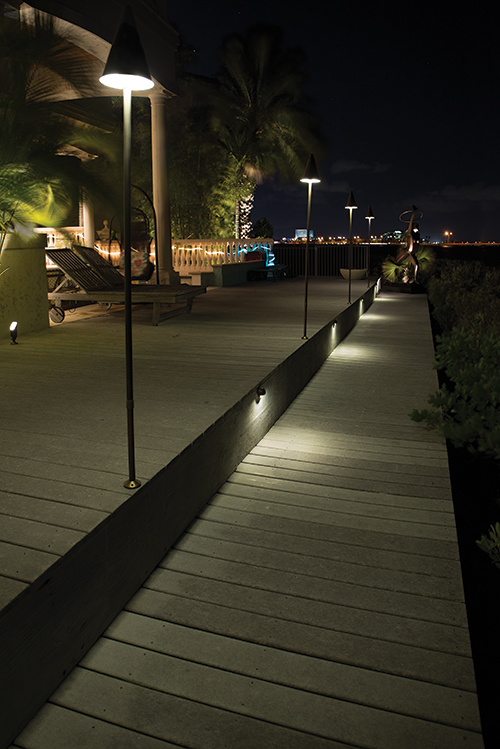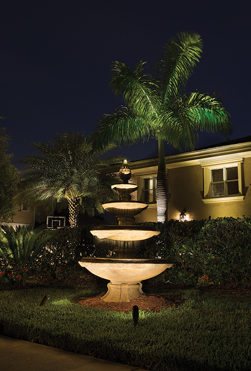 The Nallamshetty Residence Bequette's experience at the Nallamshetty residence was unique, as he was asked to primarily light the front door. The hand-carved door was imported from Pakistan, and the owners wished to have it showcased tastefully, without blinding the occupants when the door is opened. In order to accomplish this, Bequette hid a spotlight in each of the two columns by the front door. He used shrouds and honeycomb light diffusers to keep the occupants from being blinded. The three-person crew worked four days on phase one, which included the 3-watt, 4-watt and 5-watt LED spotlights on the fountain and plants as well as the spotlights on the front door. Phase two is forthcoming in the backyard, which overlooks the water. The Langstons Residence When the owner purchased this Apollo Beach, Fla., home, several do-it-yourself lighting kits were installed in the front yard. Some of the fixtures were functional; others were not. Bequette was asked to make the existing system work, and to make it better overall. He used what he could of the old material in the front of the home, and installed new lighting around the backyard pergola and in small palm tree pots on the pool deck. For the pergola columns and surrounding trees, 5-watt cast brass spotlights with adjustable shrouds were used. In the center of the pergola, a 5-watt downlight with an extended shroud hangs to illuminate the ground under the structure. Since the home is elevated, concealing the wiring for the lights on the pool deck posed a bit of a problem. Bequette and his two installers ran the wires underneath the pool deck through a conduit to a box near the pergola. As foliage grows in, it will hide all of that from view while still allowing access for repairs or additions. The project took three days to finish. Because Bequette is so passionate about the design work he does, he is more than willing to work with a client until everyone is happy with the design. The passion he puts into his work allows his designs to shine, brilliantly.