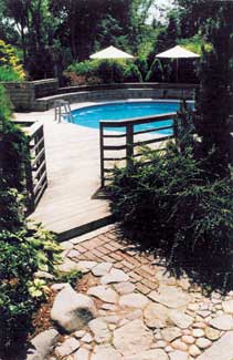 My wife and I realized the landscape seemed to be in a constant state of change so that an above ground pool might be more appropriate than an in-ground which would obviously be more permanent. However, we did not like the look of an above ground pool. The challenge became one of artfully grading a 24 foot diameter pool down into a donut of earth, then constructing a surrounding deck. The pool and the first section of deck were completed the first year of this endeavor, surrounded by new landscaping on the donut of earth. It took two more years to complete the circular cedar deck with curved walls, seating and pool house with trellis screening.