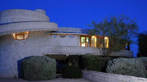 The design of Frank Lloyd Wright's Phoenix home in Arcadia was designed to afford views of the orange orchards. A spiral ramp leads up to the main level of the concrete block home. The inside is even more engaging.