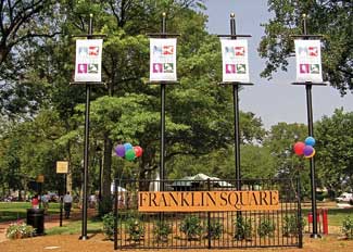 Looking at Philadelphia’s Franklin Square today, it is hard to imagine the dilapidated condition it was in only a few years ago. Located between the Vine Street Expressway and the entrance to the Benjamin Franklin Bridge, the square had become an afterthought, enveloped by modern day hustle and bustle over the years. A far cry from what was imagined by William Penn when he designed it over three centuries ago, Franklin had become the black sheep of the five original squares planned in the city’s layout. It was meant to be preserved as a public-used green space, like the other four–Logan Circle, William Penn, Rittenhouse and Washington Squares. The other squares were maintained and used by picnickers regularly through the years, and while some may have changed shape, their landscapes have been kept pristine and green.