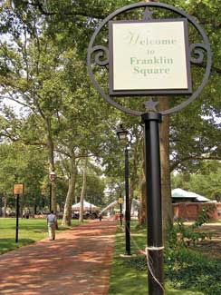 Franklin Square, does not have the fame of the other four Philidelphia squares, but has a rich history nontheless. In 1741, a portion of the square, which was then known as Northeast Square, was released to the German Reform Church for use as a burial ground. Before 1815, it also served as an open common, providing pasturage and a site for horse and cattle markets. During the Revolution the square held a powder house, and in the War of 1812 it served as a drilling ground for troops. In 1825, ten years after the city began to level and plant the ground, the square became “Franklin Square” in honor of Benjamin Franklin.
