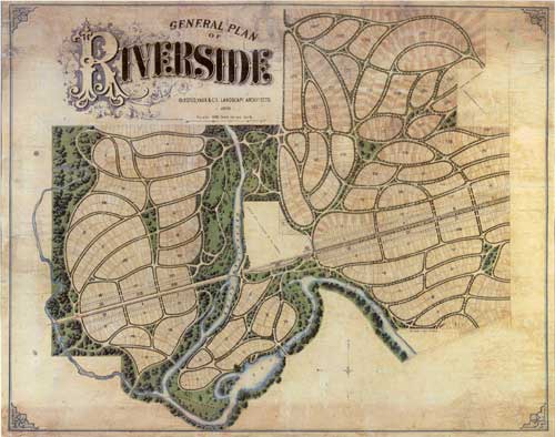 In 1868, eastern businessmen wanted to develop a countryside community near Chicago. Land by the Des Plaines River, nine miles from Chicago, was selected, and the Riverside Improvement Company (RIC) founded. That same year, RIC hired Frederick Law Olmsted and his partner, Calvert Vaux, to plan the community, based on their reputations for developing New York City?EUR??,,????'???s Central Park and Brooklyn?EUR??,,????'???s Prospect Park.