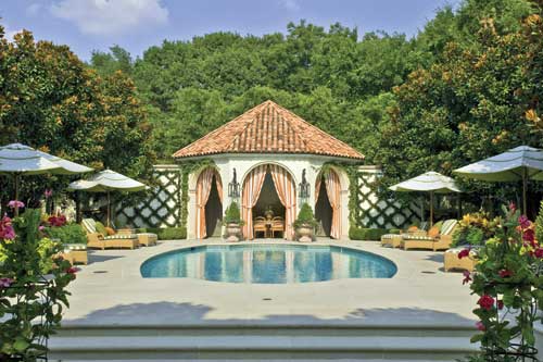The views from the loggia include the azure pool flanked by pleached magnolias (Magnolia grandiflora) and conclude at the pavilion, though the ?EUR??,,????'?????<?borrowed?EUR??,,????'?????<???EUR? scenery beyond again gives the sense that the property is much larger. Part of the inherited landscape, the structure received a ?EUR??,,????'?????<?warming up?EUR??,,????'?????<? transformation with colorful drapery, large scale lanterns and a mix of formal and naturalistic plantings. In time, rambling roses will cover the tile roof.