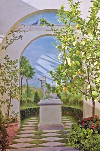 The centerpiece of the arcade garden is a fireplace with a repurposed mantle from the home?EUR??,,????'?????<???EUR?s interior, featuring an antique coat of arms flanked by lanterns designed by landscape architect Paul Fields. There is seating near the fireplace and also at the dining area close to the outdoor kitchen. At the center of the arch to the left of the fireplace is a dog statue on a pedestal, set on a limestone and grass harlequin-patterned terrace. The ?EUR??,,????'?????<?arch?EUR??,,????'?????<? and dog statue on the right side of the fireplace is actually a mural painted by the chief restorer of the Hermitage, a trompe l?EUR??,,????'?????<???EUR?oeil that mirrors the real arch. This whimsical perspective wall painting draws the eye from the real lemon trees placed in antique containers in front of the mural to the illustrated citrus allee characteristic of a southern French summerhouse garden. The hardscape here is limestone in three colors.