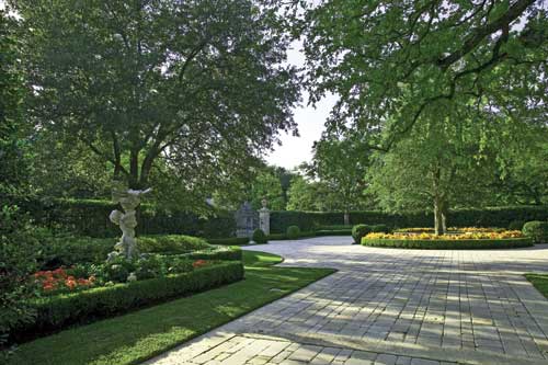 Looking back along the front and down the front garden?EUR??,,????'?????<???EUR?s expanse, the view is visually lengthened by geometrical lawn panels and beds that line a cobble offshoot of the motor court. Centered in vivid, monochromatic annual plantings is playful, Italian marble putti statuary. Within a site, garden ornaments act as both foci and collectively provide unification. Terminating the southern axis is a recumbent stag. Its placement and the aperture of the hedge deceives the eye into thinking the garden is more extensive than its bounds. Consequently it also draws a visitor further into the garden, inviting exploration.