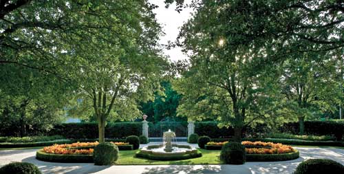 The cobblestone (Valders) oval drive leads to an antique marble fountain centered in a quatrefoil limestone, framed by a low boxwood hedge and mass seasonal plantings. Mature live oaks, transplanted on site, frame the residence, while grounding the architecture and disguising its age. The trees are healthy and thriving.
