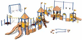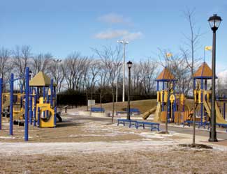 The design team challenged playground manufacturers to design custom play equipment to reflect the theme. The proposal prepared by ABC Recreation using Landscape Structures Inc. (LSI) equipment was selected as it clearly evoked the feeling of the French ch?????teau with its peaked turrets on tall towers, while at the same time providing a variety of play ?EUR??,,????'??events?EUR??,,????'??? with a range of challenge. The two main structures were placed opposite each other across the central walkway to create a village street scale to foster creative and imaginative play. A large berm was created next to the playground to provide a place for winter sliding and create a ?EUR??,,????'??lookout?EUR??,,????'??? for imaginative play. This adds to the play opportunities and helps to shape the playground space by creating a visual edge.