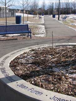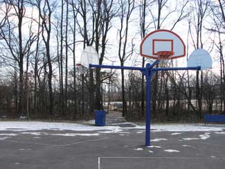 The main walkway through the park is a promenade linking the playground area, formal gardens adjacent the playground and a circular seating node strategically located next to the existing hedgerow where all walkways meet. It creates another seating opportunity away from the playground and a vantage point where one can overlook the park activities and playground. Just beyond the hedgerow is the basketball skills court, aligned on the central axis and linked to the main walkway by a trail through the hedgerow trees. This places the basketball activity next to the school and in an area where the inevitable noise and commotion it generates will not likely be bothersome to other park users or neighbors.