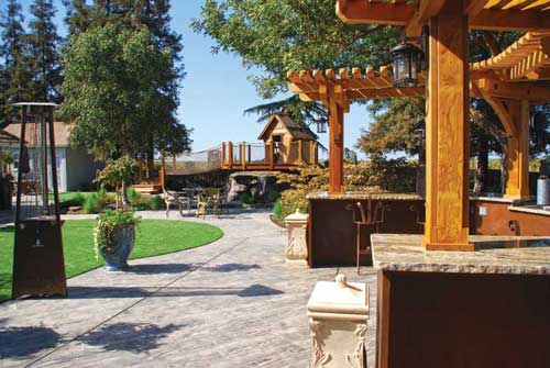 Lidyoff Landscape crews then started excavation of the areas that would use synthetic turf. After excavating down 8 inches and installing chicken wire and weed barrier, class-2 base rock in 2-inch compacted lifts was installed. The top layer of decomposed granite was installed prior to the synthetic turf. Crews installed 3-inch solid drain lines for roof drains and planter areas, as well as all gas lines for the fire pit, BBQ area, and three outdoor heaters. An irrigation system was installed using in-ground Rain Bird valves and pop-ups. The large specimen trees behind the playhouse, among them 36-inch box crape myrtles "Dynamite," 54-inch box Chinese pistache, 48-inch box crape myrtles "Red Rocket," 24-inch box Japanese maples, and 60-inch box "Atlantica" cedrus, were from the Lidyoff Landscape nursery division. They installed all shrub material purchased through Central CA nursery suppliers. Andy Hebert of Homecrafters, who has been involved with the team for almost 30 years, was hired to implement an original outdoor kitchen concept. Sergio and Paul with Heritage Bomanite, who Lidyoff has worked with on projects throughout California for many years, also contributed to the project.