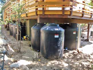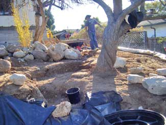 The result required 20 tons of sandstone boulders, all locally obtained to minimize energy use in shipping per the client?EUR??,,????'?????<????????????EUR??,,??s desires. Seven rainwater storage tanks with three collection points provide roughly 6,000 gallons capacity for both the water feature and irrigation. LED lighting both in the pond and along pathways conserve energy. Recycling was also utilized as much as possible, with the rubble from a failing CMU wall utilized as fill surrounding a perforated drainage pipe behind the replacement wall.