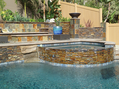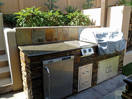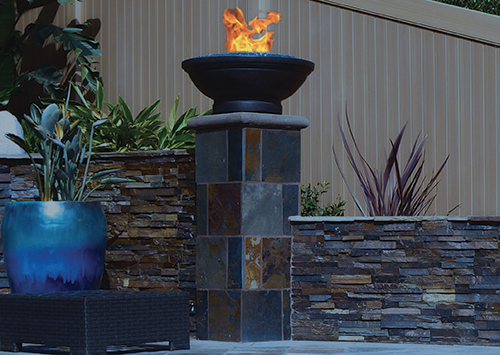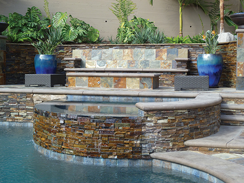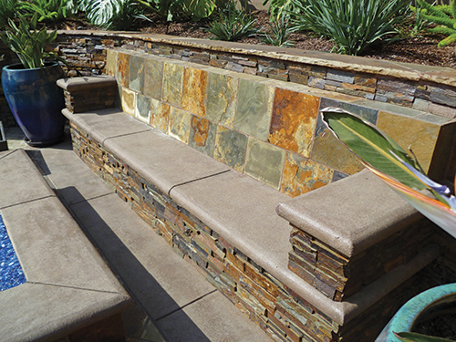 The residents of this Redondo Beach, Calif., home wanted to renovate their backyard into a more useable outdoor space where they could spend quality time with family and guests - relaxing, entertaining, and playing. On their wish list were a spa, a fire pit, an outdoor cooking and dining area with an attached patio cover, and as large a pool area as possible while not excluding any of the other requested elements, and still having adequate and comfortable room left over. To meet their desires, Sandi Fields Landscape Design truly had to make best use of the available space. Prior to the remodel, the backyard consisted of an undersized patio area, a deteriorating patio cover, a lawn area and retained slope area, and wood property line fencing severely damaged by animals. In the redesign, using materials that would resist animal damage from raccoons and skunks was a priority. Ultimately, the 28'x16' pool area became a focal point as well as an activity area. The pool had to be hand dug due to limited side access. About 60 cubic yards in total were excavated through hand digging and a dump truck. The landscape company owns all tools and equipment used during the process. To absorb the height of the slope, the pool area was elevated 18 inches, the 8'x 8' negative edge spa was raised 2 feet, and the 6'x 32" fire pit with custom built-in bench was placed in the upper deck level. Two fire bowls mounted on columns frame the built-in bench and fire pit. The new covered patio area has an outdoor furniture arrangement of sofa, chairs, a coffee table, a dining table, an outdoor flat screen TV and radiant heaters for warmth. The outdoor kitchen area has a granite counter top and bar with seating for six. Paving and pool decking were a combination of 12"x 12"slate and sealed sandstone colored concrete. The pool coping was a poured in place colored concrete. Since the primary use area was shifting to the back of the yard, the team worked to provide privacy from the neighbors view as well as areas to draw people into the whole space. This included a safe space for children to play and a space for outdoor entertaining that can easily accommodate a large group. Other challenges included absorbing some of the height of the hillside by using different heights and elevations of elements, and correcting poor drainage issues that were present due to the existing patio.