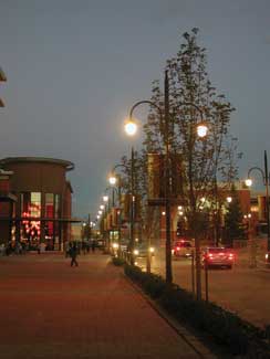 Downtown main streets have become themed centers, and shopping malls “lifestyle” centers. Entertainment has become an additional design element for such venues. The design needs to meet the needs of the people living, working and otherwise functioning within the space. Lighting is a central, often thematic, element, but requires companion elements to fully bring the site plan together and satisfy people’s expectations.
