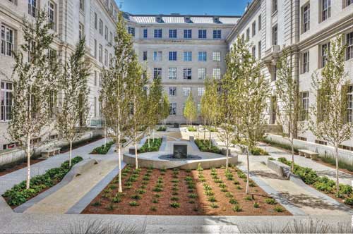 Plants/Trees As the six story height of the building does not allow for the courtyard to receive much light, it was important the courtyard trees and landscape be shade tolerant. Specified for the space is a grove of 32 birch trees, and 16 plant beds filled with deer fern, "El Campo' cape rush and island alumroot. However, artistically, there was an entirely different reason. Garten explains: "Since the sculpture is about the ground plane, the birch trees provide a counterpoint of upward movement. Also, their white bark complements the white bricks of the building." The plants not only do well in low light, but are drought tolerant, which meets one of the LEED criterion.