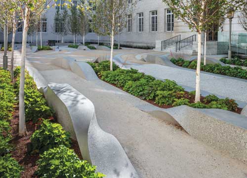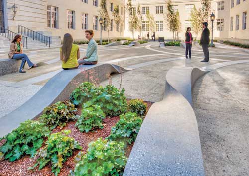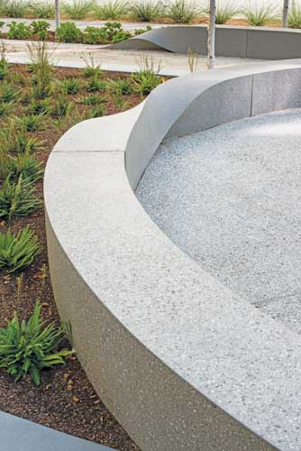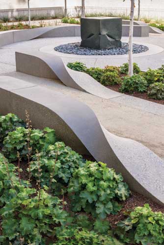 Sculpture The sculpture, the center of this courtyard project, is 455 linear feet of rising, twisting and falling seat walls that depict flowing ribbons. This rhythmic sculpture was digitally cut in foam, from which fiberglass molds were created. The molds, which were fabricated by Quick Crete, were then used to make the recycled and cast concrete bench sculptures. The courtyard has 4,012 square feet of decomposed granite walkways, a fitting and aesthetically pleasing permeable surface for this high foot traffic area.