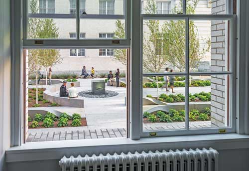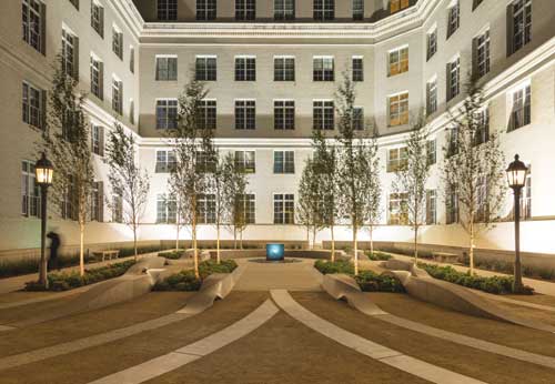 Lighting Landscape lighting from the original build in 1936 includes eight light posts around the courtyard, which were refurbished and rewired to accept LED lighting. Other lighting includes 9-watt LED Hydrel 4800 Yoke mounted fixtures to uplight the fountains, and NP6-LED-BZ uprights by FX Luminaire used throughout the plant beds, to uplight the birch trees.