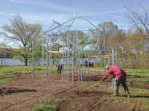Randall's Island Park in New York City has a new public structure thanks to the pro bono efforts of many. Called Ghost House, it was commissioned by the NYC Department of Parks in partnership with the Bronx Museum of the Arts. The concept for the sculpture originated with artist Wilfred Smith's Fences Furniture sculptures, a series of furniture constructed entirely of chain link fence. All chain link products were generously donated and delivered on site to the project by Illusions Vinyl Fence. Ghost House expanded Smith's concept to delineate the entire home, inspired by the many baseball backstops in Randall's Island Park. This sculpture uses the often overlooked material to create a delicate three-dimensional drawing of a house executed in woven steel wire and pipe. Ghost House has a footprint of 18 by 24 feet, and stands 16 feet in height. Industry guidelines were followed in the design and detailing of the structure, using standard chain link fence fabric, pipe, and fittings. Following a site visit with Eric Peterson, deputy adminstrator for Randall's Island Park, Debbie Unger, turf manager, arrived early one chilly morning to layout the footprint for the sculpture. 458 Construction and Fence Company supervised construction and donated installation services. Ghost House would need a total of 23 concrete footings for all the necessary posts. In preparation for excavation, the crew used mason's line and spray paint to locate each footing for augering. The crew arrived in the afternoon to drill the holes with the Bobcat auger. Hiding below the surface was an absurd amount of bricks, concrete and granite. The crew drilled as possible without breaking the auger bit, but more powerful equipment would be required. Unger suggested ordering some sod for the Ghost House. She sent some of her crew out one rainy afternoon to help get the sod placed. The sod would prove to be one of the critical parts of the Ghost House installation, making for incredibly inviting carpeting for the entire house.