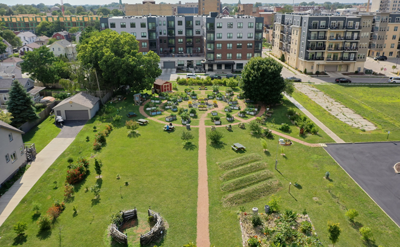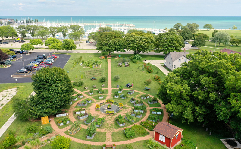 St. Matthew's Lakefront ElderGarten located in Kenosha, Wisconsin, was once a vacant plot of land between downtown and the lakefront that was turned into a senior community garden for those 55+. The space promotes health through gardening and social interaction in a park-like setting. Designed by Tim R. Garland, RLA, owner of Garland Alliance, Inc., the ElderGarten includes a Celtic cross that came to be because of community support ranging from local businesses and artists to Boy Scott troops and individual donors since inception.