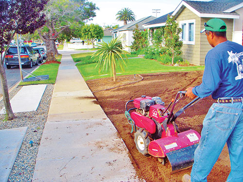 Workers stripped off the old turf layer by hand, and then rototilled the earth beneath using a Honda 77RTB Rototiller. After mixing in new soil, they dug a series of trenches, spaced at 12 inches apart and dug at a set three inches deep. Workers used a Honda Trencher #RTV7721 to trench the canals.