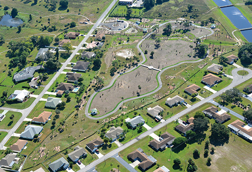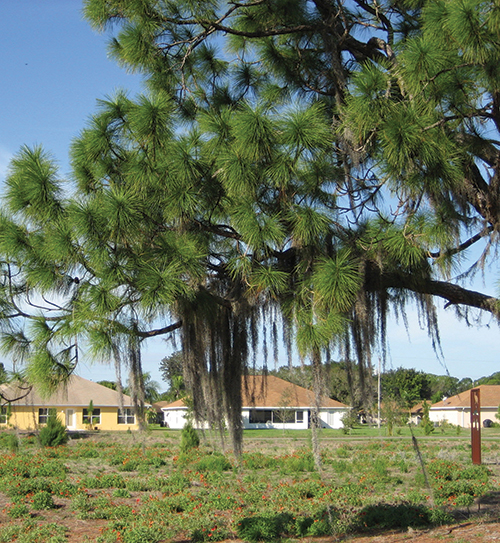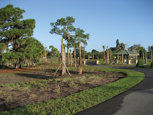 Prairie The three-acre prairie contains grasses and wildflowers, which replaced Bermuda grass that required mowing, fertilizing and pesticide/herbicide application. Thirteen types of wildflowers and grasses were used in this area, including purple lovegrass, lopsided Indiangrass, muhly grass, partridge pea, blanket flower, spotted beebalm and sunshine mimosa. This area is maintained by Sandhill Native Growers, Inc. & Environmental Services who visits the site once a month to hand pull weeds and to perform herbicide spot treatment. This takes six to eight hours with a crew of six. This in itself is a challenge for workers, as hand pulling weeds is a tedious job and spraying the herbicides can pose a threat to the wildflowers and grasses. Trees & Palms Although 90 percent of the trees were preserved from the golf course, an additional 297 trees and 381 palms were added, including red maple, dahoon holly, southern red cedar, jacaranda, south Florida slash pine, longleaf pine, live oak, bald cypress, as well as sabal and saw palmetto palm trees. Lee County Parks & Recreation maintains the overall park and the trees, which are currently irrigated twice a week. This will eventually be reduced to an as-needed basis once the trees are fully established, which generally takes about a year. The trees have not been pruned since the park opened in December of 2013, but will be pruned in the future on an as-needed basis when requested by the facility supervisor. Although the parks department does not have a set crew to manage this park, it relies on a staff of ten, which are rotated between over 100 parks in the county.
