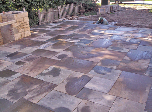 A large Honeylocust tree and the tree preservation ordinances of the Village complicated the creation of the bluestone path. The ordinance stated that nothing could be built under a tree's drip line. The winding bluestone path was formed using square bluestone pieces cut to form an irregular shape and allow the walkway to conform to its desired shape. A bluestone patio was envisioned as an elevated patio with a random pattern of larger and smaller pieces that created the irregular pattern.