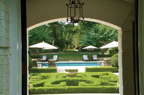 A boxwood parterre is set on axis between the pool cabana and the pool and creates a moment of interest as one approaches the pool. The Green Velvet Korean boxwoods handle pruning and have proven to be a good alternative the traditionally used English boxwood. A forced perspective is created by expanses of turf terraces beyond. A Provençal wall fountain terminates a turf panel. This fountain feature is set on a cross axis with the boxwood parterre.