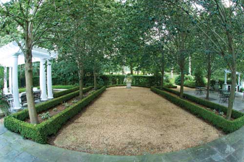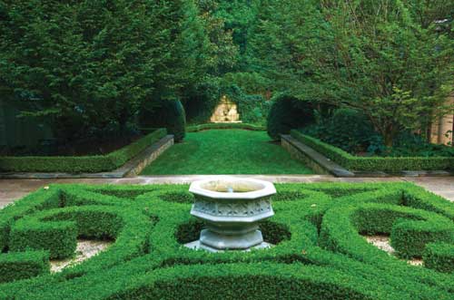 The centerpiece of the lower entertainment area is a fountain constructed of French Provençal limestone surrounded by a decorative "Green Velvet' Korean boxwood parterre in the French formal garden fashion. "Green Velvet' boxwoods take well to pruning, and are a proven alternative to English boxwoods. The axial view of the fountain on one side is from the pool cabana to the pool; the other axis is to a turf terrace and an allée of Lindens that create privacy.