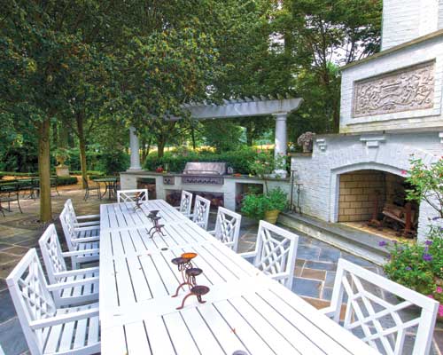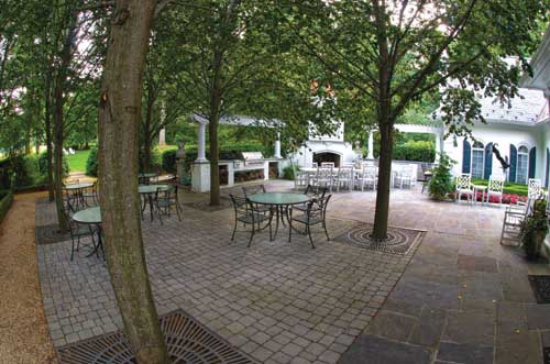 A large dining table affords ample room for family gatherings. Adjacent to the outdoor fireplace and service bars is another terrace, set within a bosque of linden trees. This expansive terrace affords space for larger dining parties, while still preserving an intimate setting. The trees are set within tree wells and are surrounded by cast iron tree grates. The trees are up lit, and the patio is illuminated by tree-mounted down lights. The lighting effect is subtle and is continued into the other adjacent spaces that include a bocce court, a pergola and fountain. The pergola is constructed with AZEK synthetic lumber and the columns are fiberglass composite. Using these materials greatly reduces the maintenance associated with this garden feature.