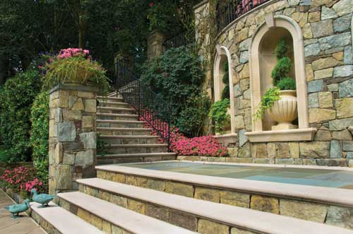 The fountain feature has an external pool pump and filter that is secreted within the plantings. The shell of the fountain is poured-in-place concrete with Pennsylvania flagstone coping. An observation terrace was constructed in the second phase of the garden improvement. This terrace is connected to the pool level via a wall and step system. The connecting steps and walls that support the observation terrace are veneered with Carderock Stone and capped with Indiana limestone. The bullnosed limestone threads were made to order. Custom iron railings feature bronze Belgium handrails. Three Haddonstone niches are set within the curved wall section and offer interest and depth to an otherwise simple stonewall. The Haddonstone planters are watered with drip irrigation spaghetti tubes.