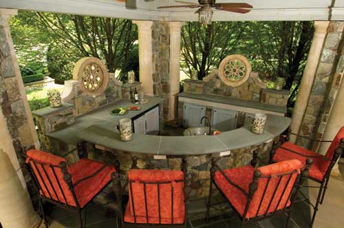 The L-shaped pool cabana features a corner bar and covered seating area. A poolside grill is tucked away behind the covered space. The design of the covered area features heavy cedar beams and a standing seam, leaded copper roof. The swimming pool terrace has square limestone pavers set on a diagonal pattern. The reflective character of the limestone keeps feet cool even during hot summer days.