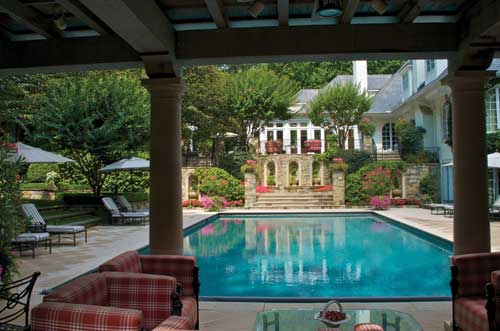 This private residence is nestled in the undulating hills of Great Falls, Virginia. The house and gardens underwent significant alterations particularly suited for indoor and exterior entertainment. The client arranged a team of design professionals and artisans to undertake the project. The collaboration between Daniel Lee, architect, Barry Dixon, interior design, and Charles Owen, landscape architect, president of Fine Landscapes, Ltd., collaborated to bring the project to fruition. Fine Landscapes performed the exterior landscaping. The exterior gardens landscaping was conducted in stages, beginning with the upper level concourse and the entry court. A subsequent phase involved the addition of a changing facility for the pool, a covered entertainment area, resurfacing of pool terraces and garden enhancements. The upper level concourse is on the same level as the kitchen and the day-to-day interior spaces. These spaces give way to an exterior entertainment area. The overall space is divided into four distinct spaces all connected by common walks and terraces. An outdoor fireplace combines with a built-in grill and side burner on one side, and a wet bar on the other side.