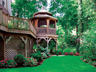 Green Earth built a gazebo and a private sitting patio constructed of chiseled bluestone beneath, adding “moonlight” down-lighting fixtures to illuminate the gazebo and the underlying sitting area.