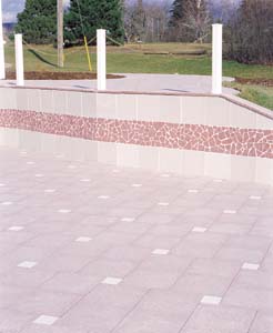 The decorative cladding on the small retaining wall was installed using the mortar technique. First, affix the pavers or tiles to the concrete with adhesive and space accordingly. Once the pavers are in place, the joints are filled with grout. After installation, allow the grout to cure for a few days and then seal it. John Price, owner of Price's Cobblestone based in Chester, Nova Scotia installed Quartzitec tiles around a homeowner's whirlpool and gazebo. On a 12 x 16-foot concrete slab that encompassed the whirlpool, Price installed tiles with the mortar technique. To enhance the decking around the Gazebo, the client opted to use reddish paving stones installed on 6 inches of gravel and one inch of sand. Due to the steep sloping of the patio, Price said he installed a beach stone swale to allow water to drain.