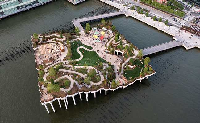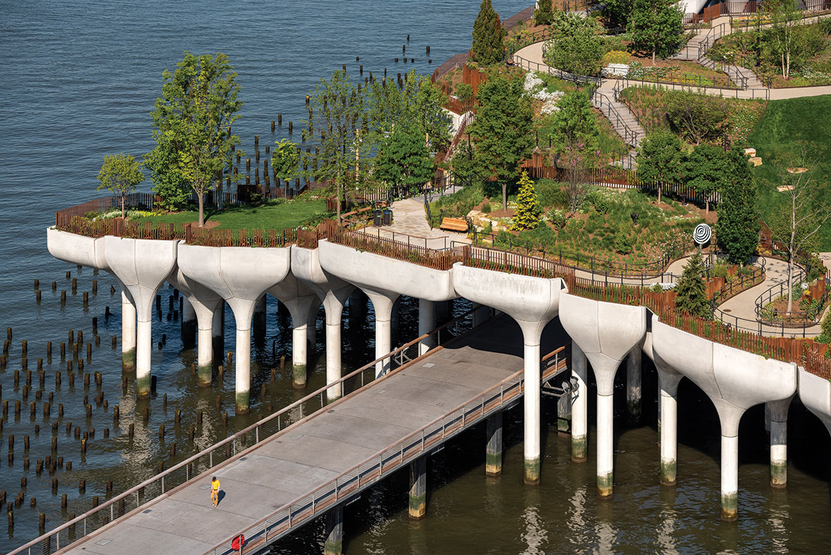 Little Island is a 2.4 acre, $260M park on a new pier located in the Hudson River on the west side of Manhattan next to the Meatpacking District. Both the Downtown Whitney Museum and a slice of the High Line are visible from the park. The pier replaces former Pier 54 where the Cunard Line maintained its primary docking facility for passenger ships. It is best known for receiving the survivors of the Titanic and from where the Lusitania departed on her ill-fated voyage. The pier eventually fell into disuse but when the Hudson River Park Trust took control of the abandoned pier in 1998, Pier 54 became a place for events and concerts. Hurricane Sandy severely damaged the pier, and it was demolished in 2015 while early plans were in the works for its replacement as Little Island. Landscape architecture firm MNLA was hired to create the landscape design for the new pier. All that remains of the historic pier is a large arch that heralds the south bridge entrance to the park and creates a dramatic threshold juxtaposing old and new. Design Details and Challenges During the early planning stages, the donor (Barry Diller of the Diller-von-Furstenberg Family Foundation) in partnership with the Hudson River Park Trust embarked on the unique opportunity to reimagine an entirely new type of public space that would create an immersive experience by weaving together nature and art. However, because of federal and state environmental regulations, the new pier could not increase the amount of coverage over the water than that of the former Pier 54. Heatherwick Studio, an architecture firm based in London and led by Thomas, proposed a square shape, rather than the traditional long skinny dimensions of a typical pier, as being more conducive to performance spaces and a park-like experience.